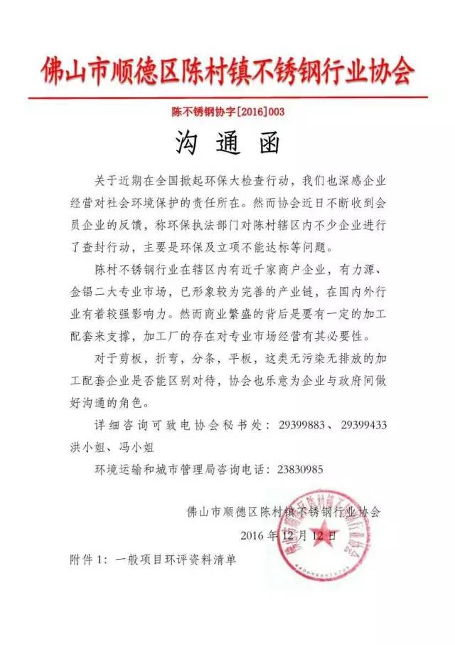 而就在本周初(12月12日),陈村镇不锈钢行业协会发沟通函,就金錩、力源两大市场剪板、折弯、分条、平板等无污染无排放的加工配套企业与政府沟通,望能区别对待。